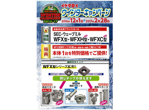 イゲタロイ ウィンターキャンペーンは2017年2月28日(火)まで対象商品チップ、高能率汎用フライスカッタ「SEC-ウェーブミルWFX型・WFXH型・WFXC型」のWFX型用チップ20個(同一型番 同一材種)ご購入につき